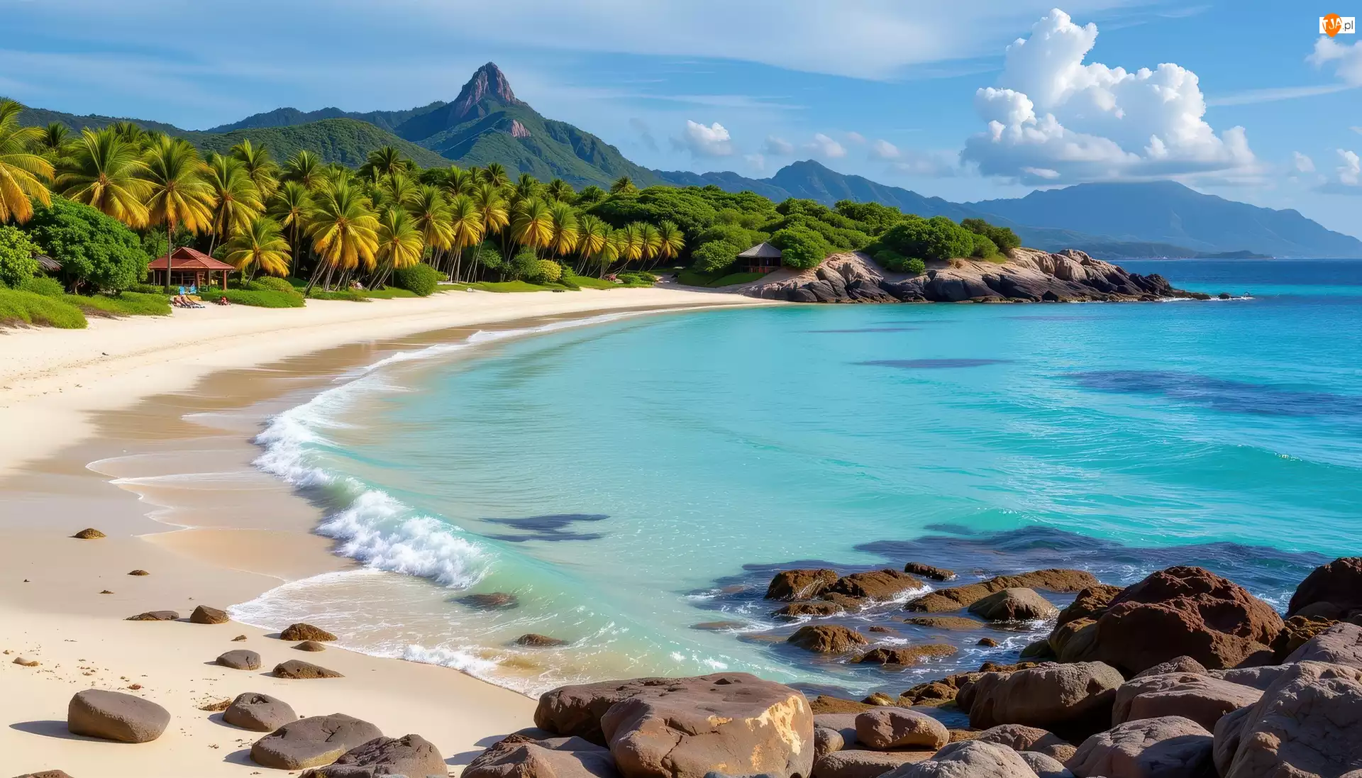 Plaża, Palmy, Grafika AI, Kamienie, Tropiki, Morze, Góry