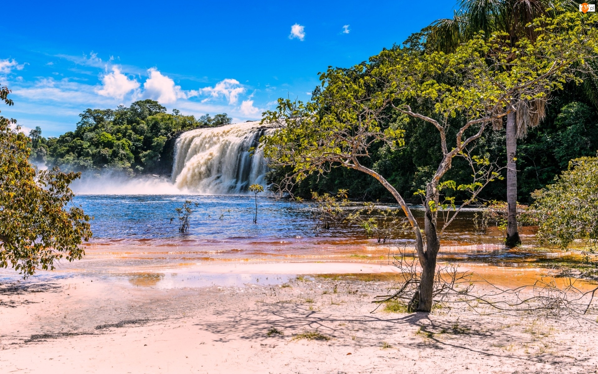 Plaża, Wodospad, Las