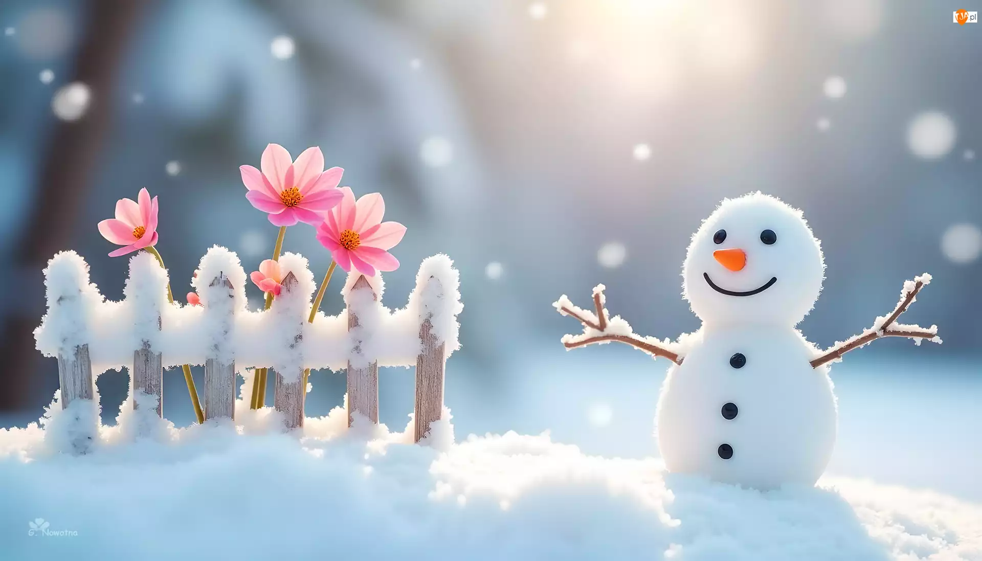 Płotek, Bałwanek, Śnieg, Grafika, Kwiaty, Zima
