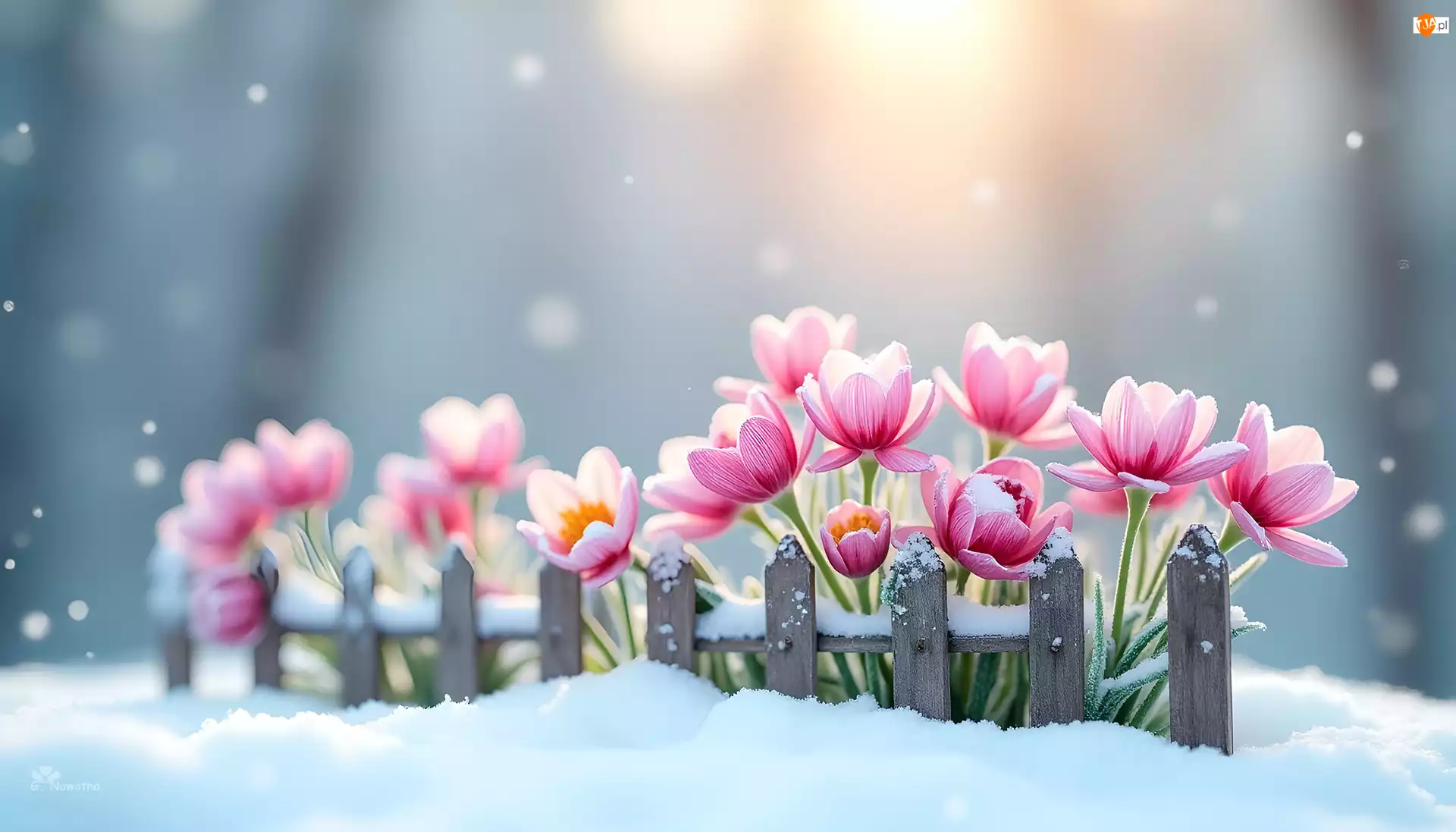 Płotek, Grafika, Kwiaty, Różowe, Śnieg
