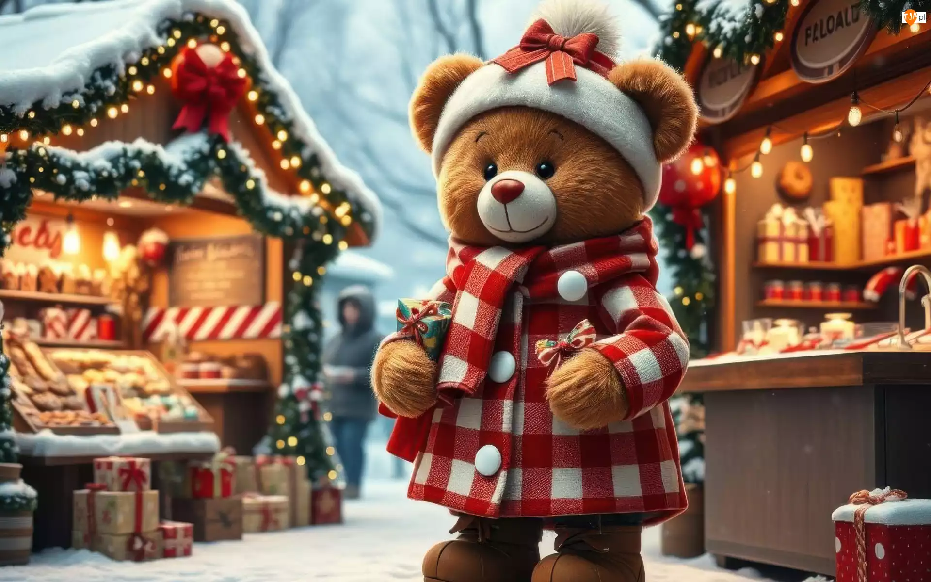 Pluszowy, Czapka, AI, Miś, Świąteczny, Jarmark, Płaszczyk