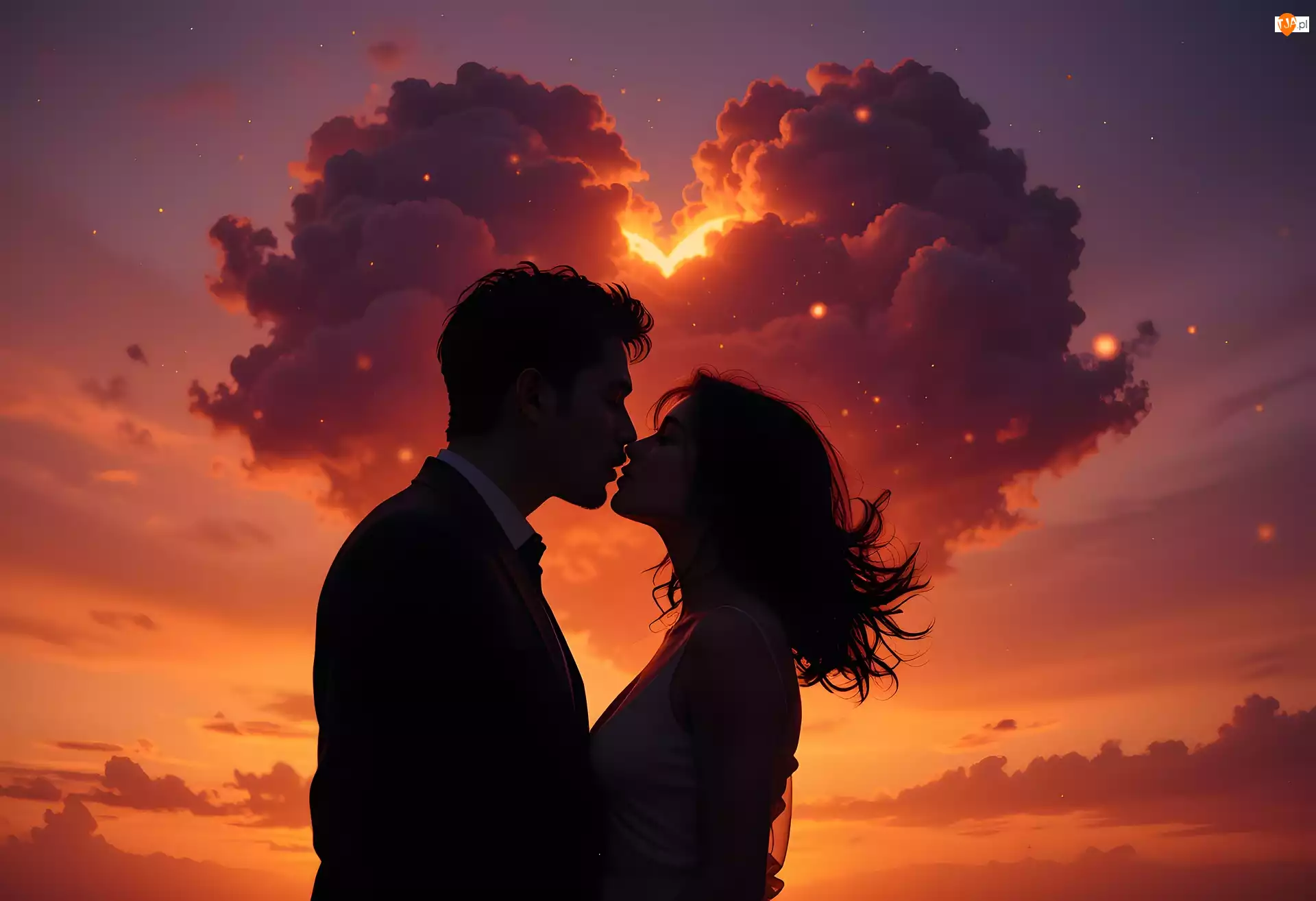 Chmury, Zachód słońca, Pocałunek, Zakochani, Serce