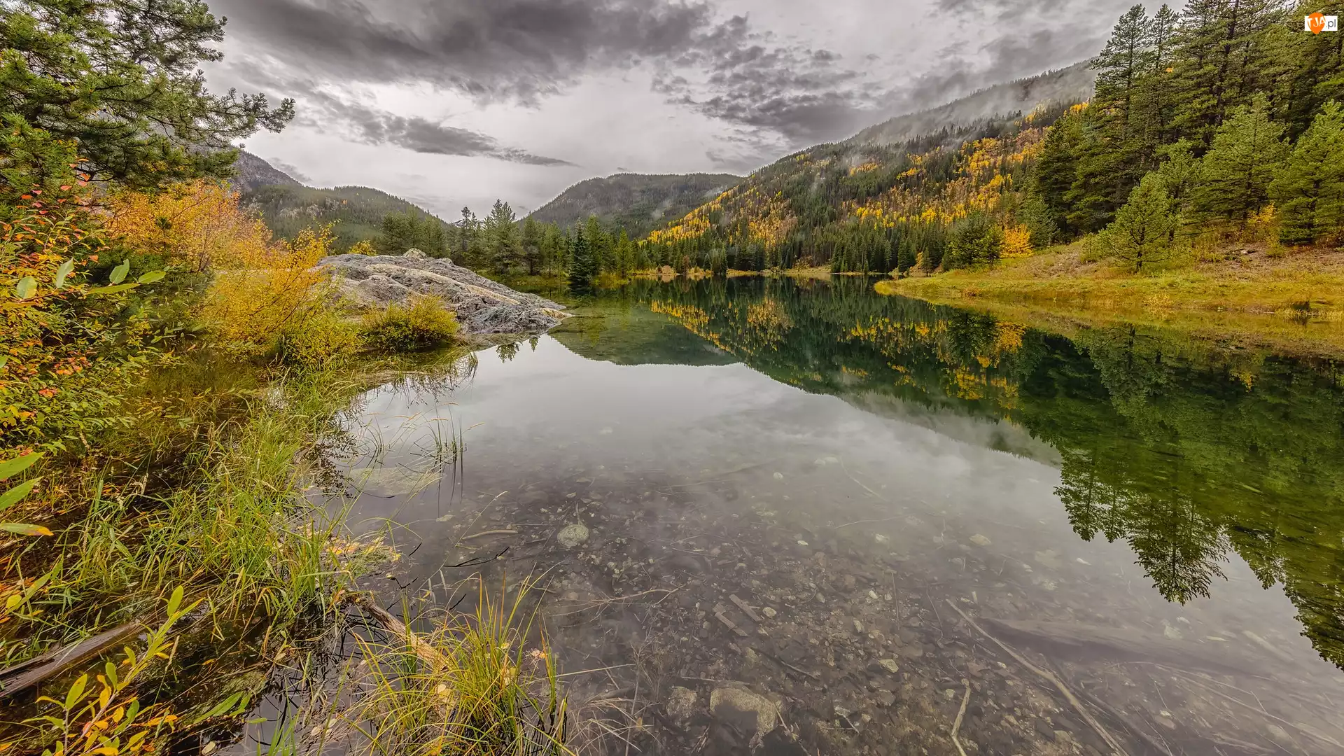 Jesień, Drzewa, Stany Zjednoczone, Góry Skaliste, Kolorado, Officers Gulch Pond, Jezioro