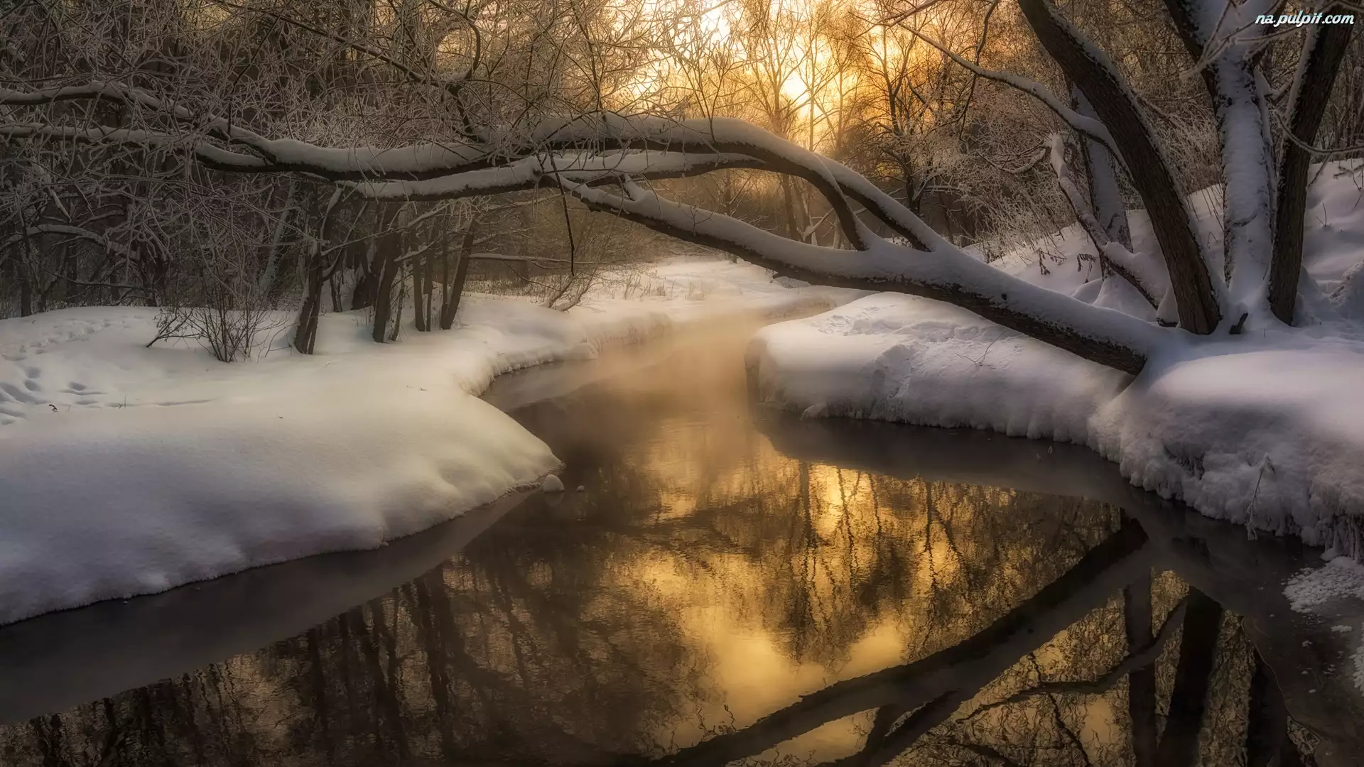 Rzeka, Śnieg, Las, Zima, Drzewa