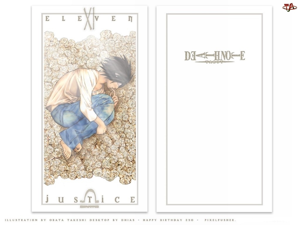kwiaty, pocztówka, postać, Death Note, napisy