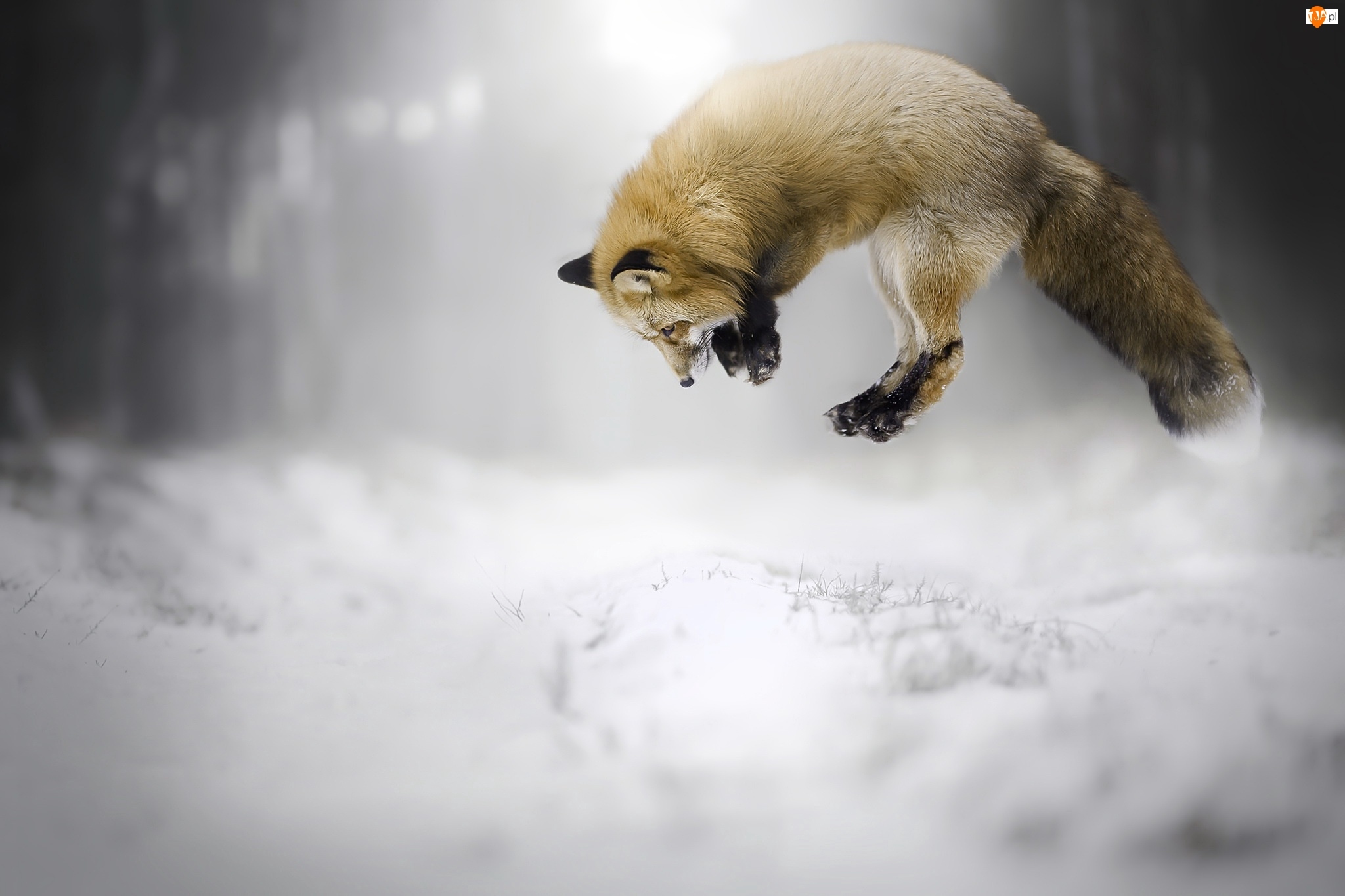 Podskok lisa na śniegu