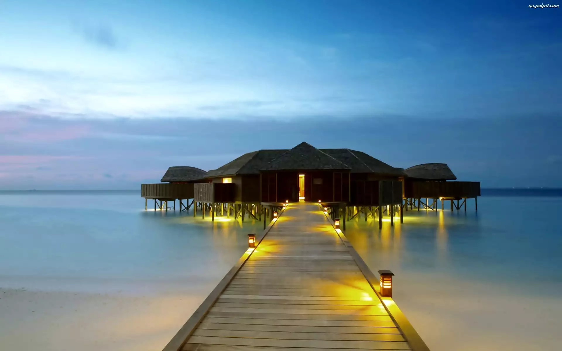 Podświetlone, Domki, Wieczór, Na Palach, Laguna, Molo