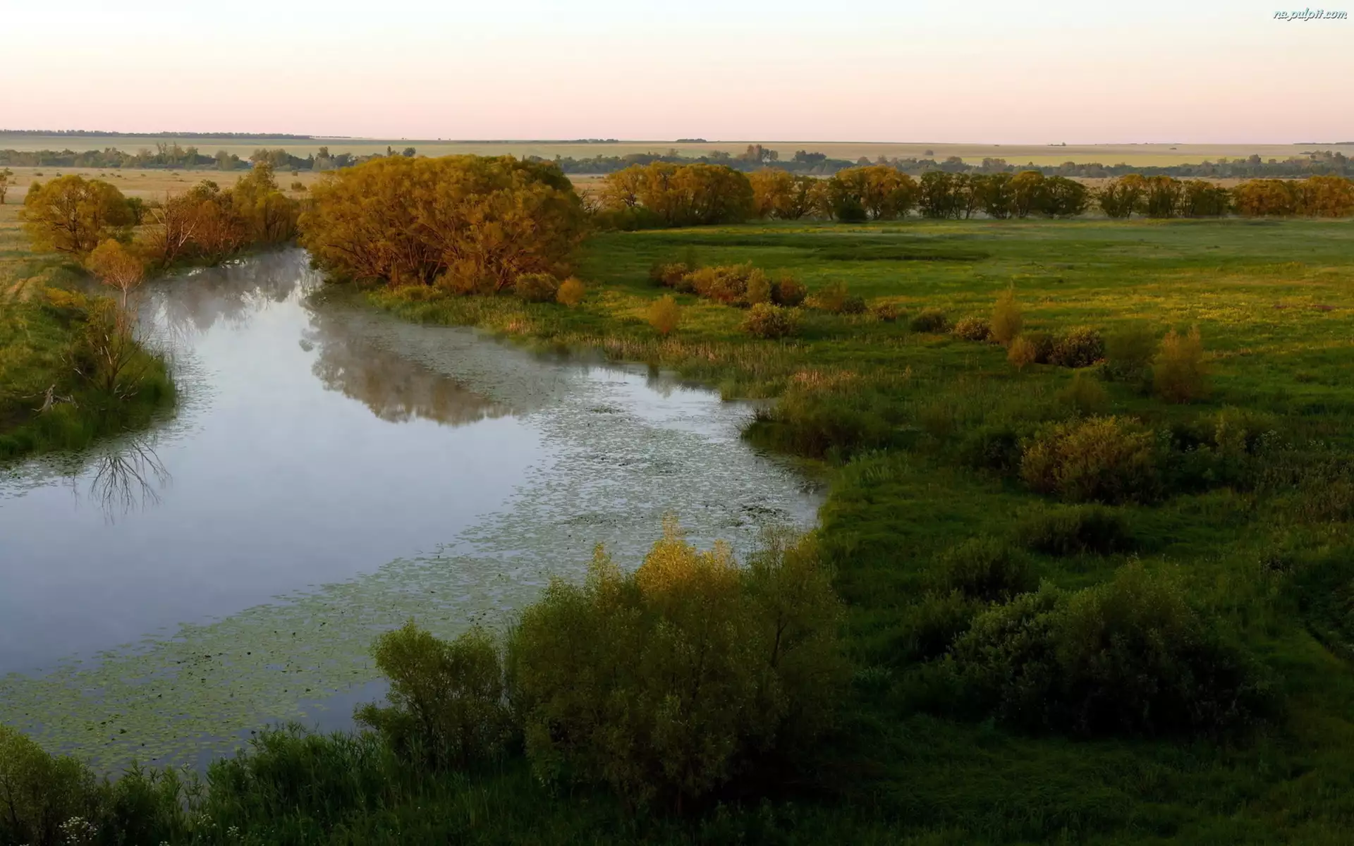 Pola, Panorama, Rzeka, Jesień, Łąki, Drzewa