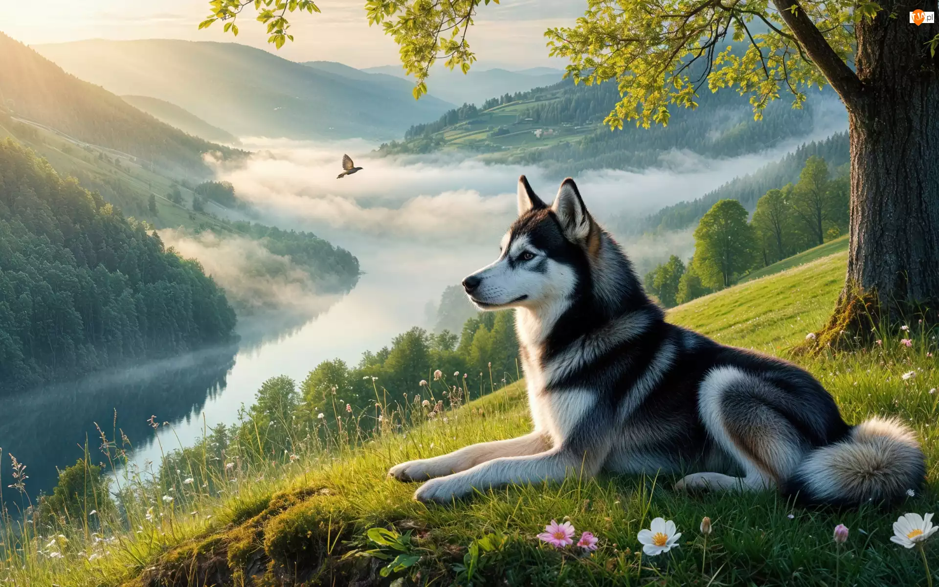 Polana, Góry, Mgła, Pies, Wzgórze, Drzewo, Siberian husky, Rzeka