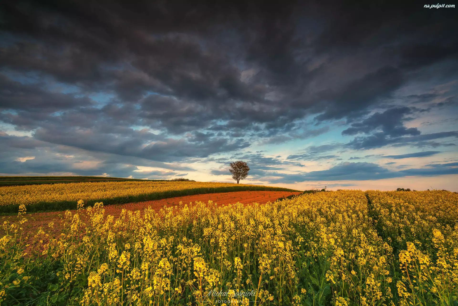 Pole, Łąka, Kwiaty, Chmury, Rzepak, Drzewo
