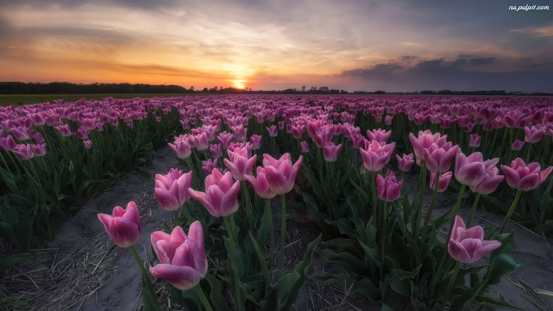 Pole różowych tulipanów w blasku zachodzącego
