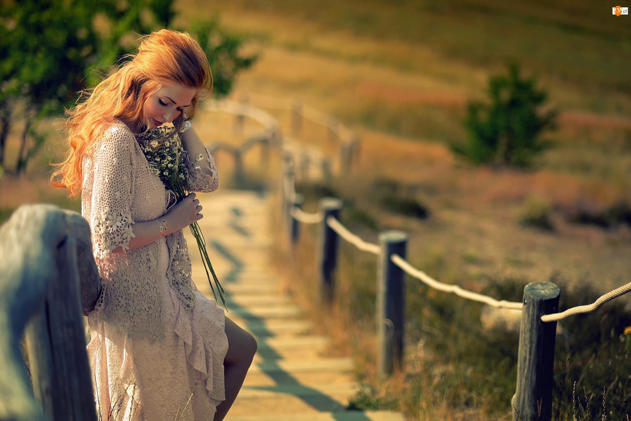 Dziewczyna, Bukiecik, Góra, Romantyczna, Pole, Schody, Rumianków