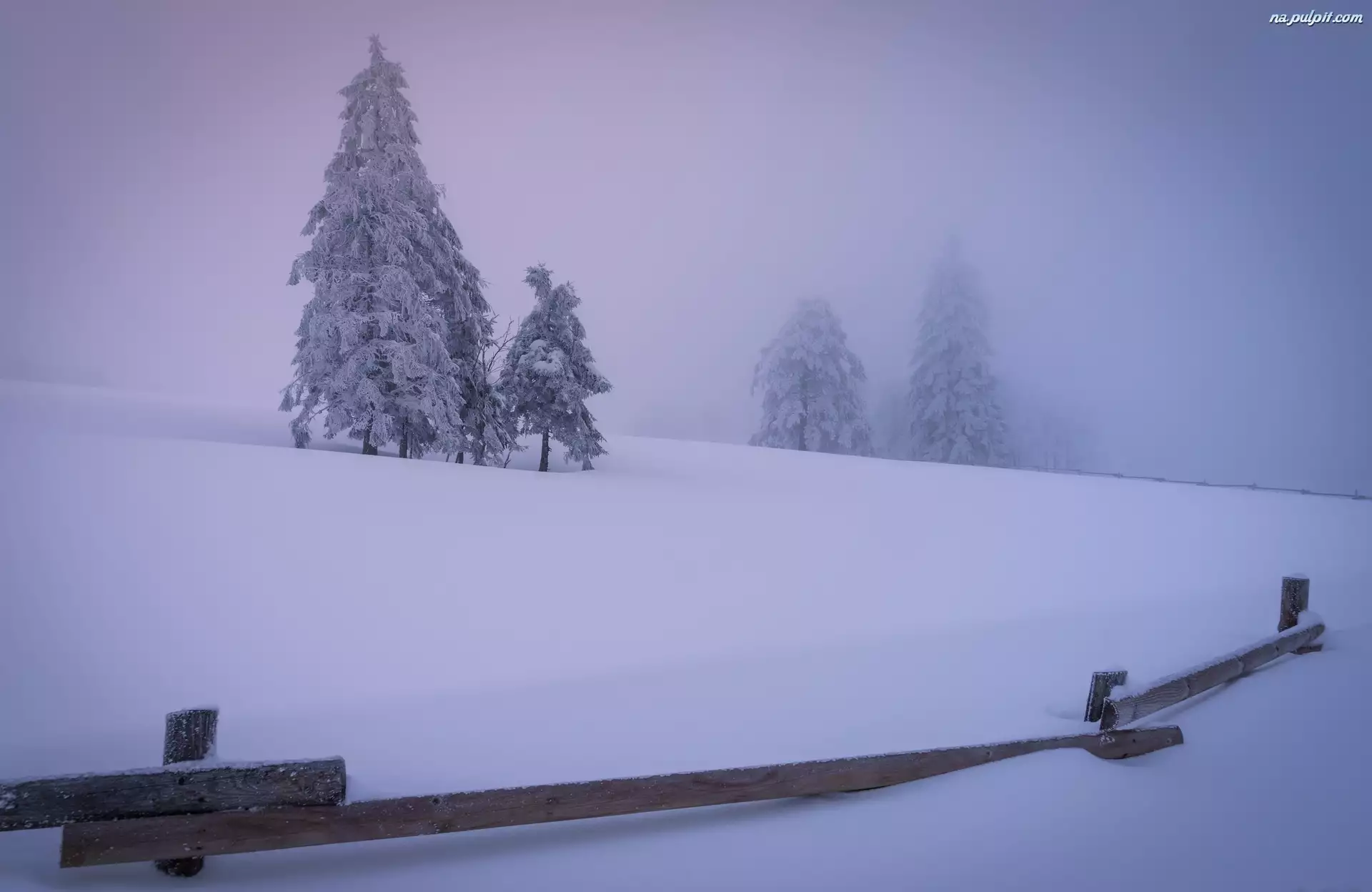 Drzewa, Ogrodzenie, Ośnieżone, Zima, Mgła