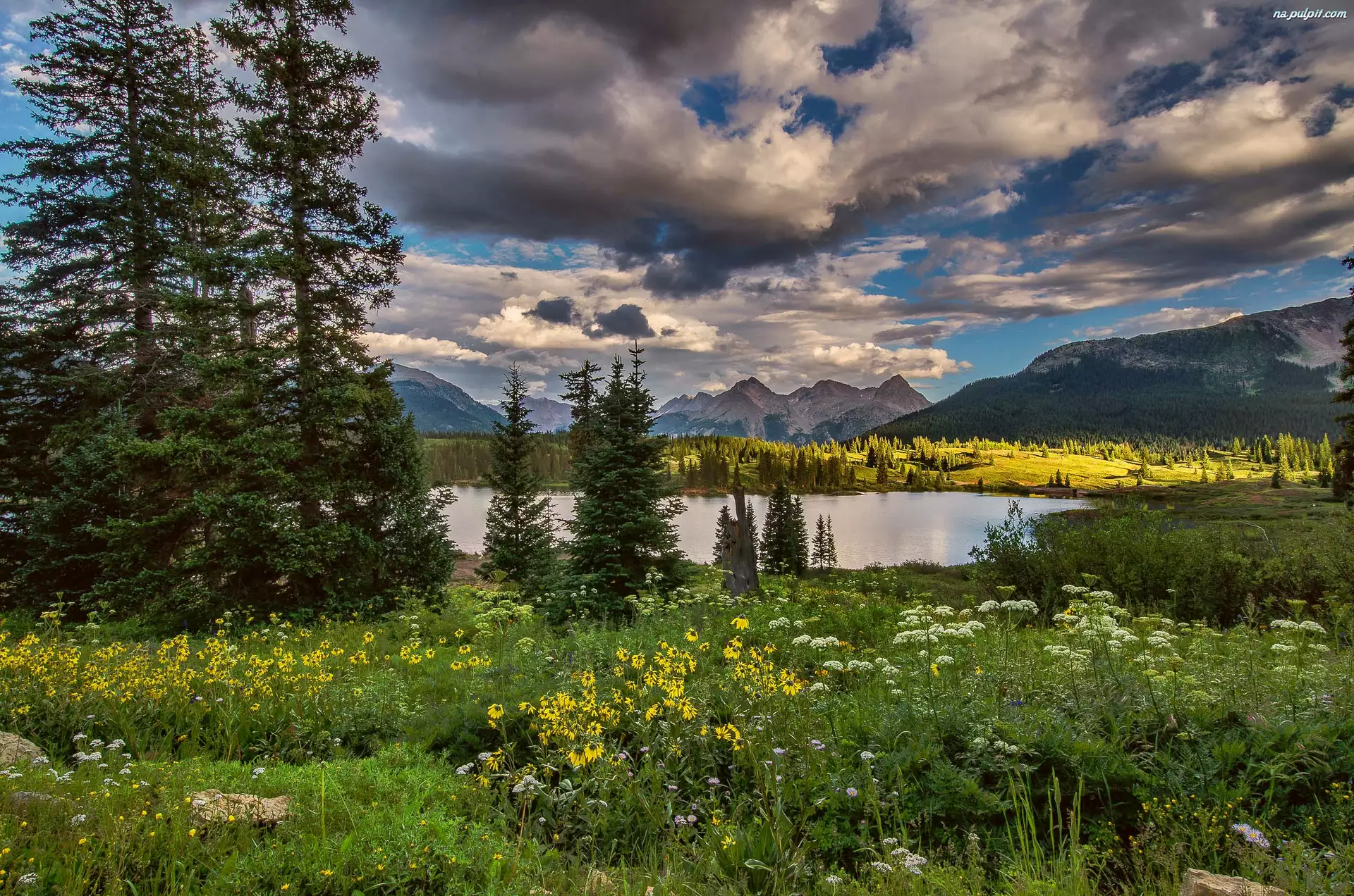 Polne Kwiaty, Chmury, Jezioro, Góry, Łąka