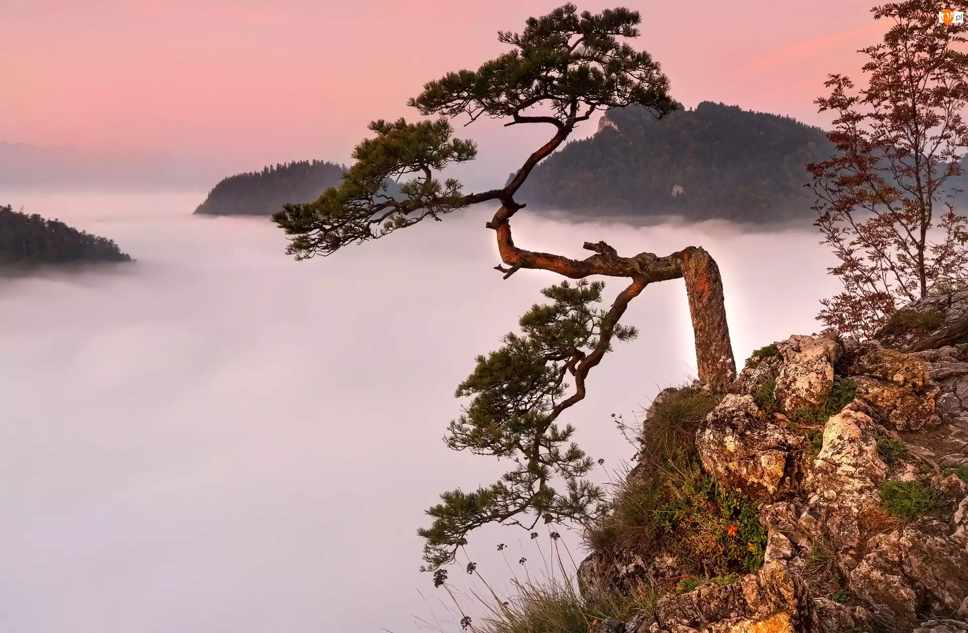 Polska, Góry, Pieniński Park Narodowy, Sokolica, Pieniny, Skała, Mgła, Sosna, Szczyt