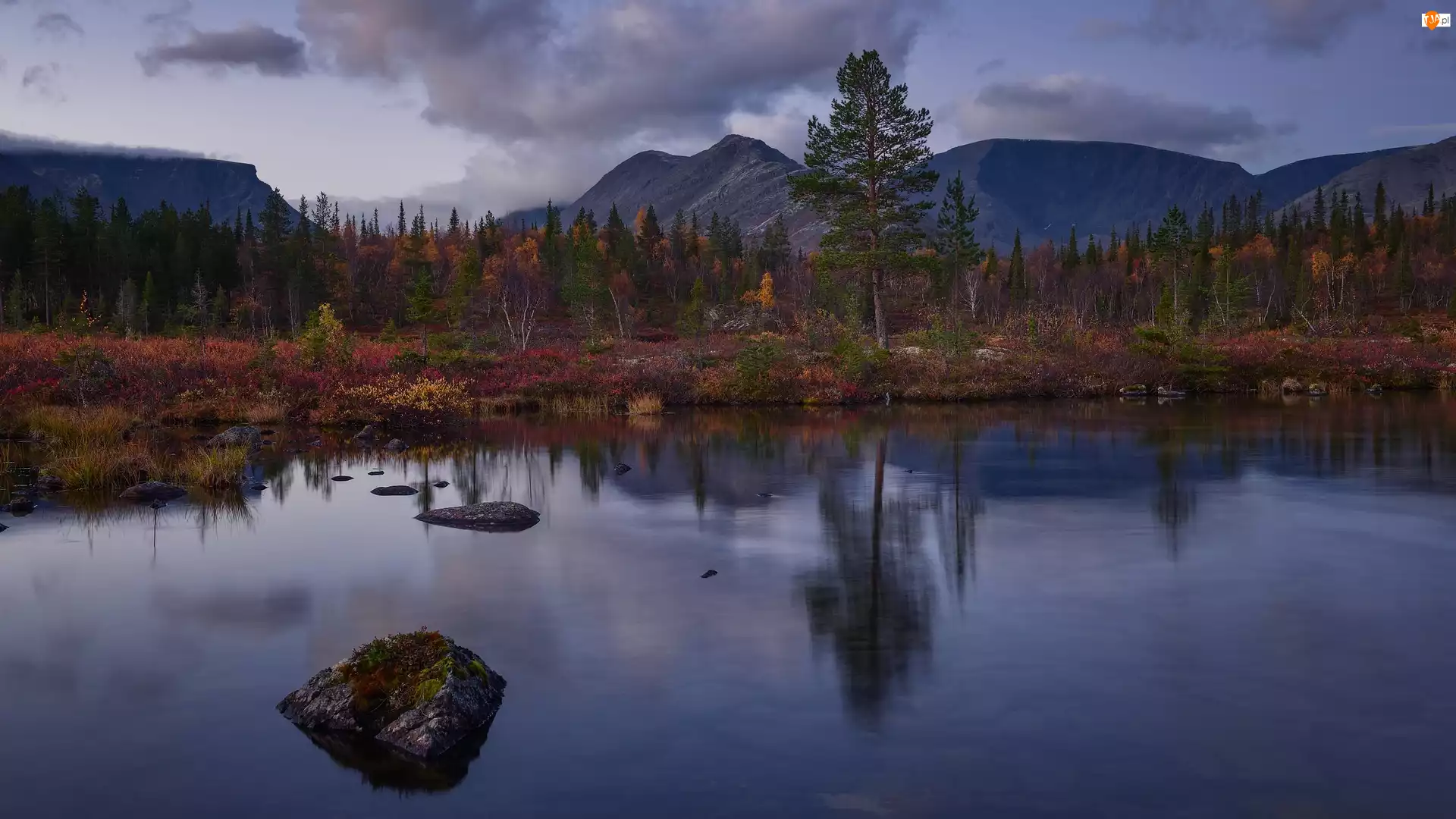Roślinność, Kołyma, Drzewa, Jesień, Chmury, Półwysep Kolski, Góry Chibiny, Rosja, Jezioro