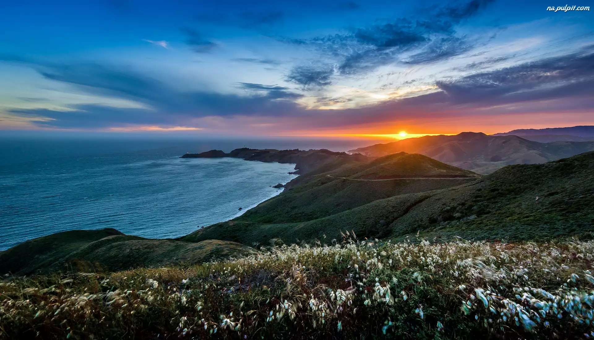Chmury, Roślinność, Ocean, Wzgórza, Kalifornia, Stany Zjednoczone, Półwysep Marin Headlands, Sausalito, Wybrzeże, Zachód słońca