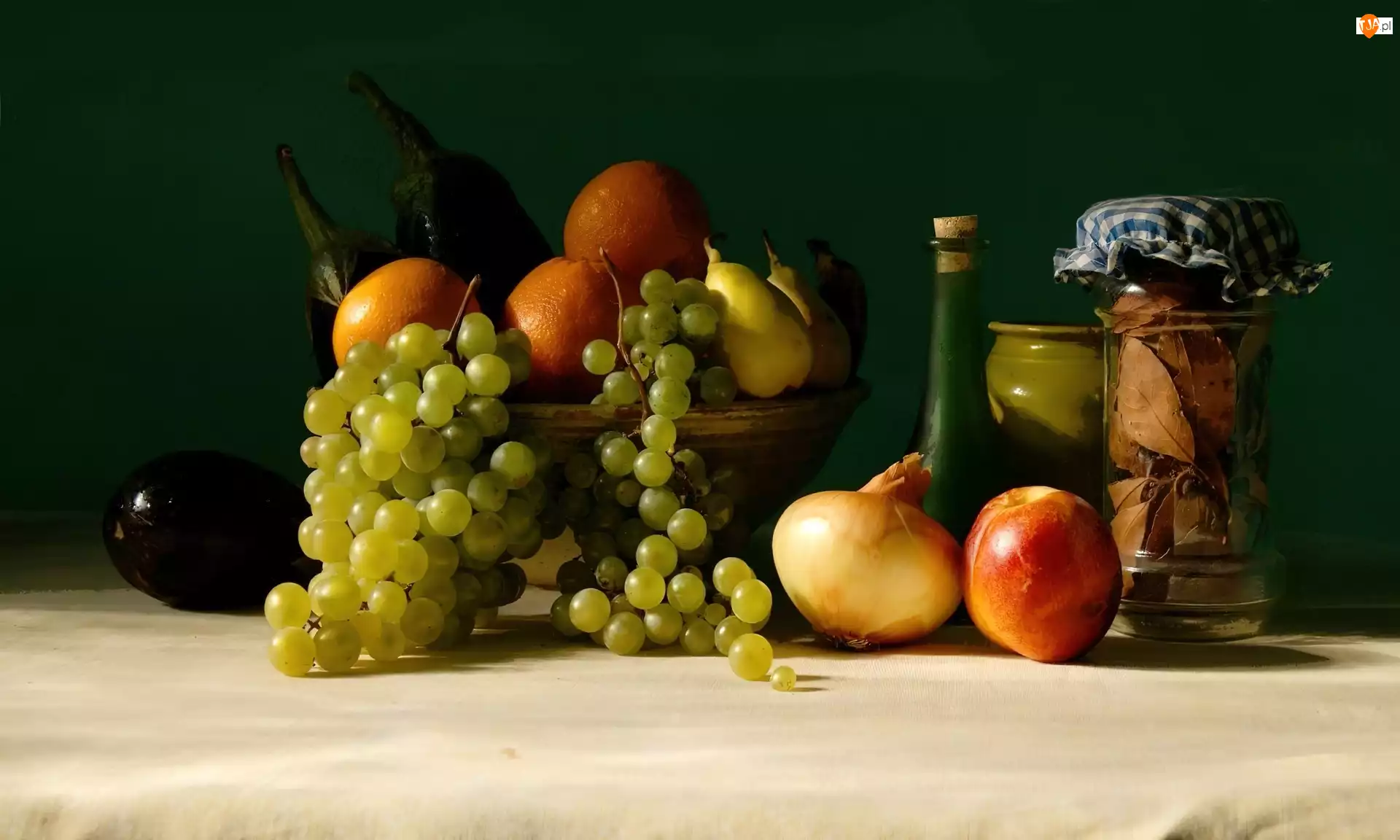 Pomarańcze, Butelka, Cebula, Winogron, Cukinia