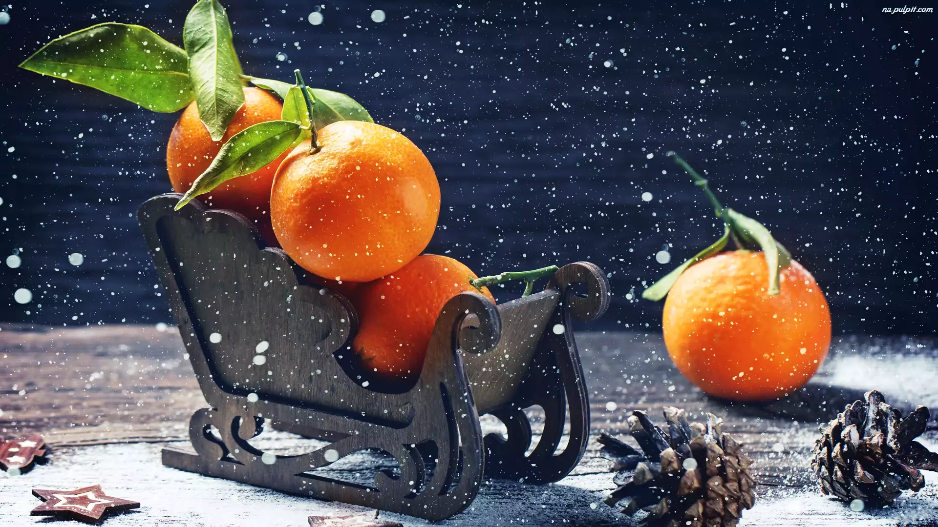 Świąteczna, Zima, Szyszki, Dekoracja, Pomarańcze, Sanie, Śnieg