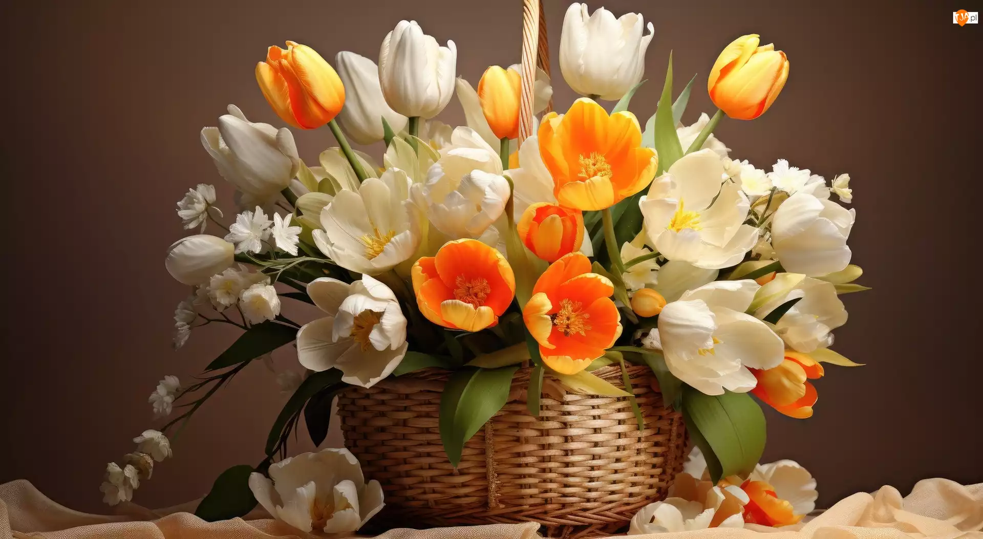 Pomarańczowe, Koszyk, Białe, Kwiaty, Tulipany