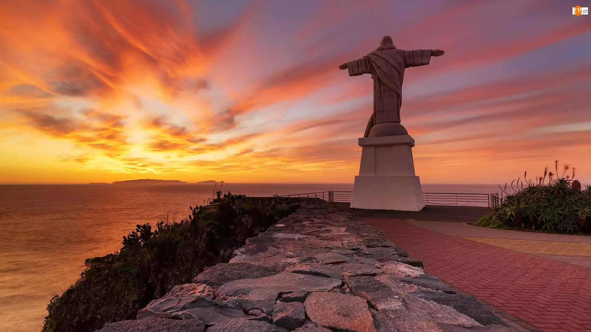 Pomnik Chrystusa Króla, Posąg, Portugalia, Morze, Madera, Garajau, Zachód słońca