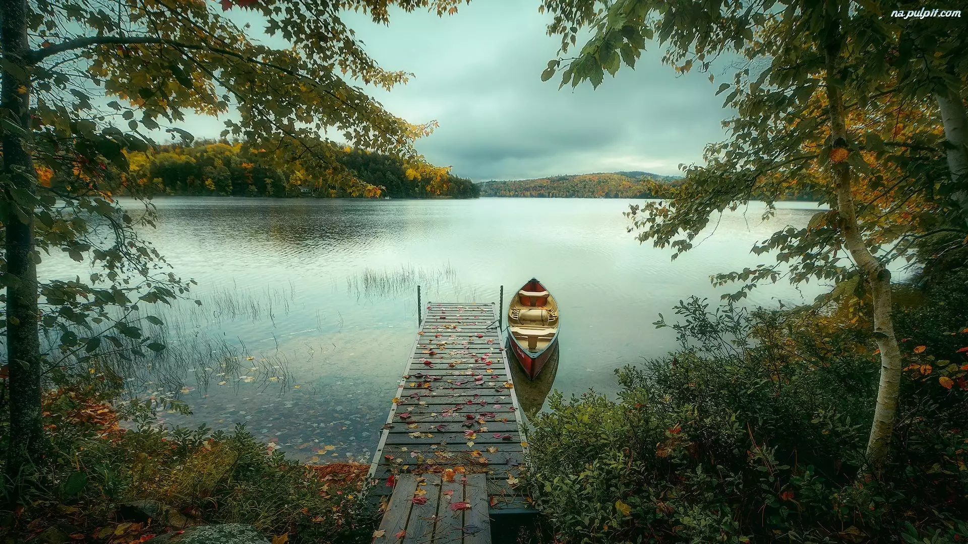 Pomost, Drzewa, Jezioro, Jesień, Łódka