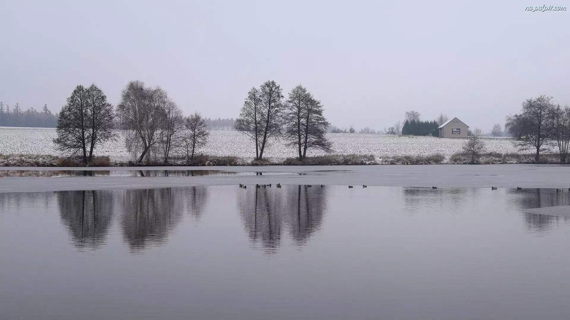 Drzewa, Kaczki, Jezioro, Zima, Pole