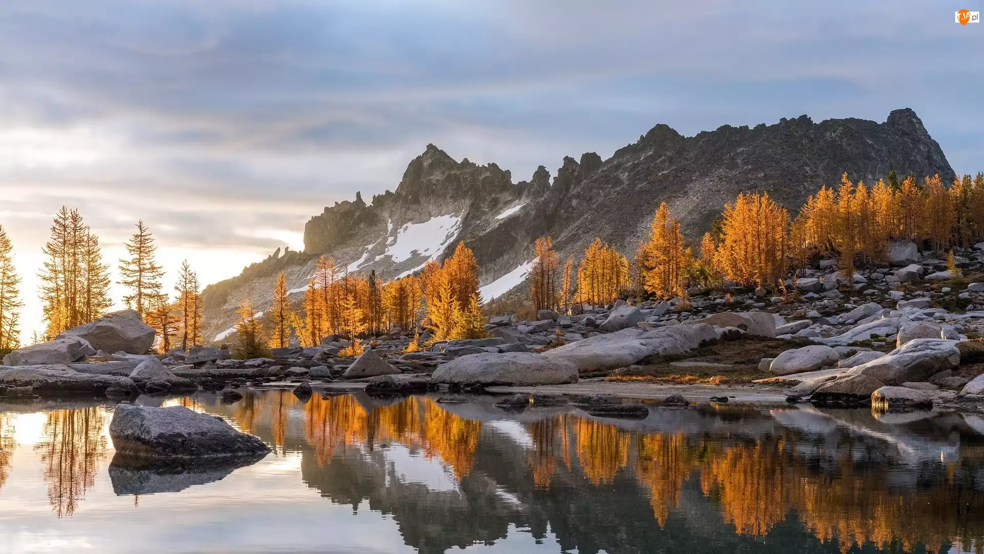 Stany Zjednoczone, Kamienie, Odbicie, Drzewa, Góry Kaskadowe, Jesień, Rezerwat przyrody, Jezioro Snow Lake, Alpine Lakes Wilderness, Stan Waszyngton