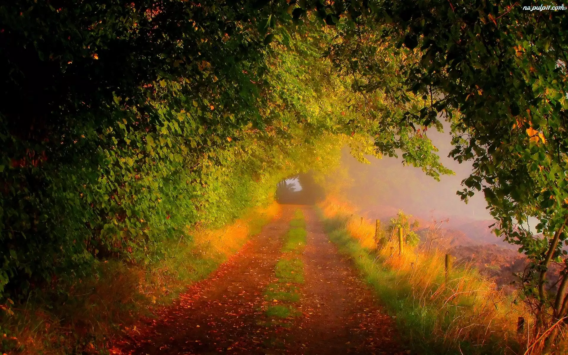 Poranek, Światło, Drzewa, Droga, Jesień, Pole, Mgła
