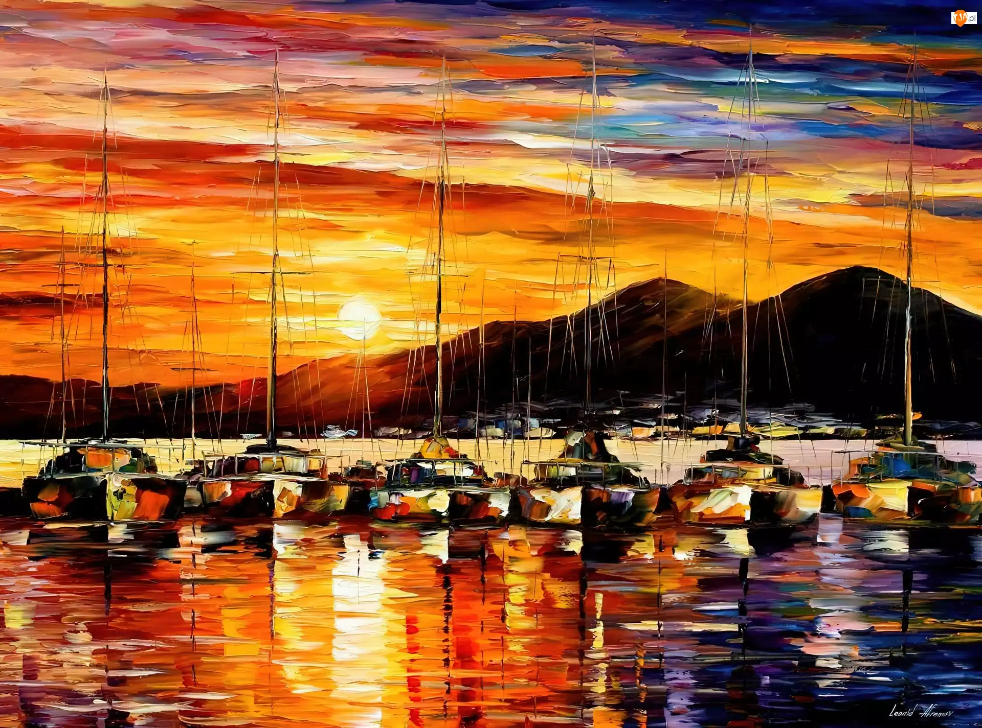 Port, Obraz, Leonid Afremov, Reprodukcja, Żaglówki