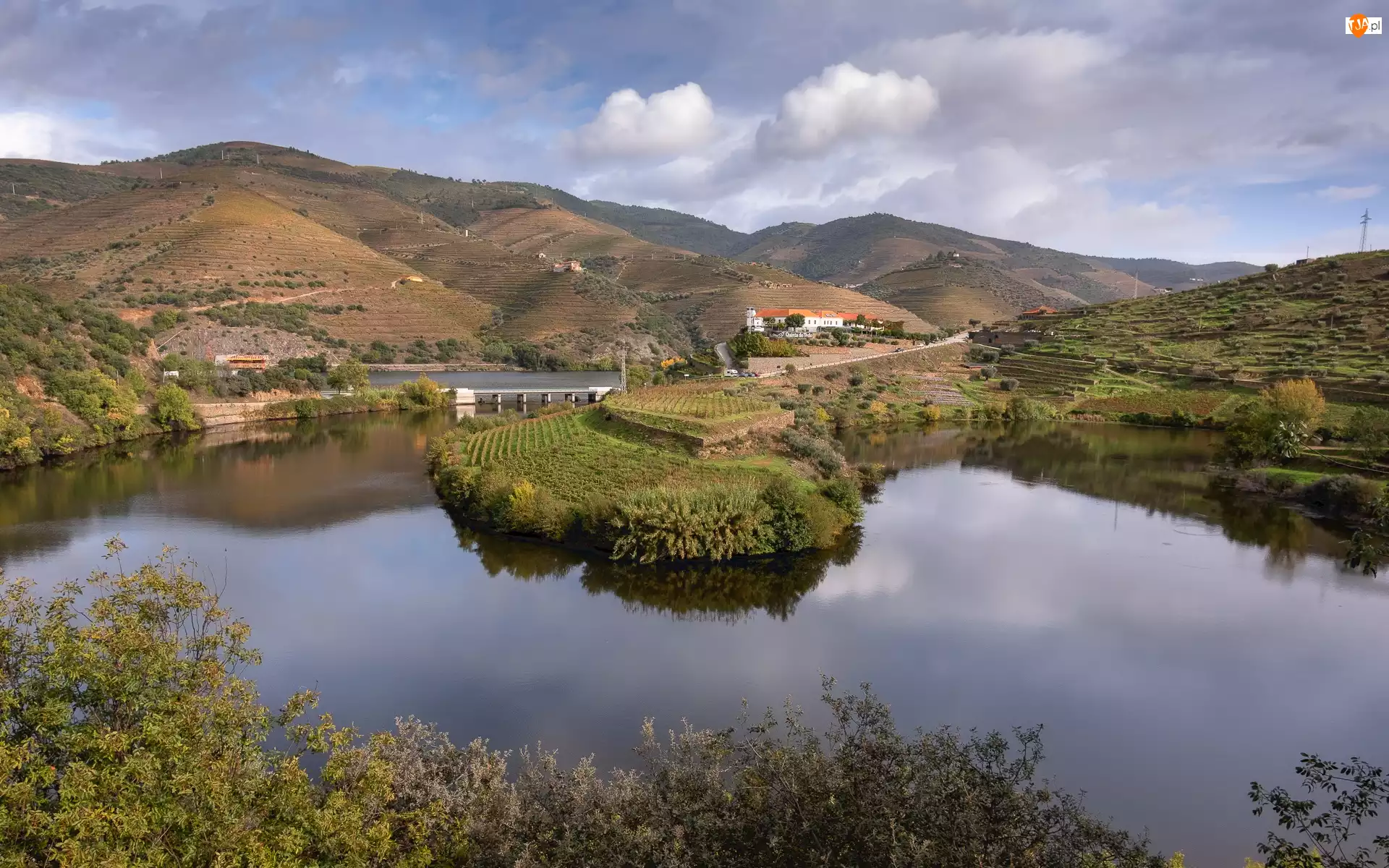 Portugalia, Wzgórza, Foz do Tedo, Drzewa, Chmury, Rzeka Tedo, Plantacje, Góry, Domy