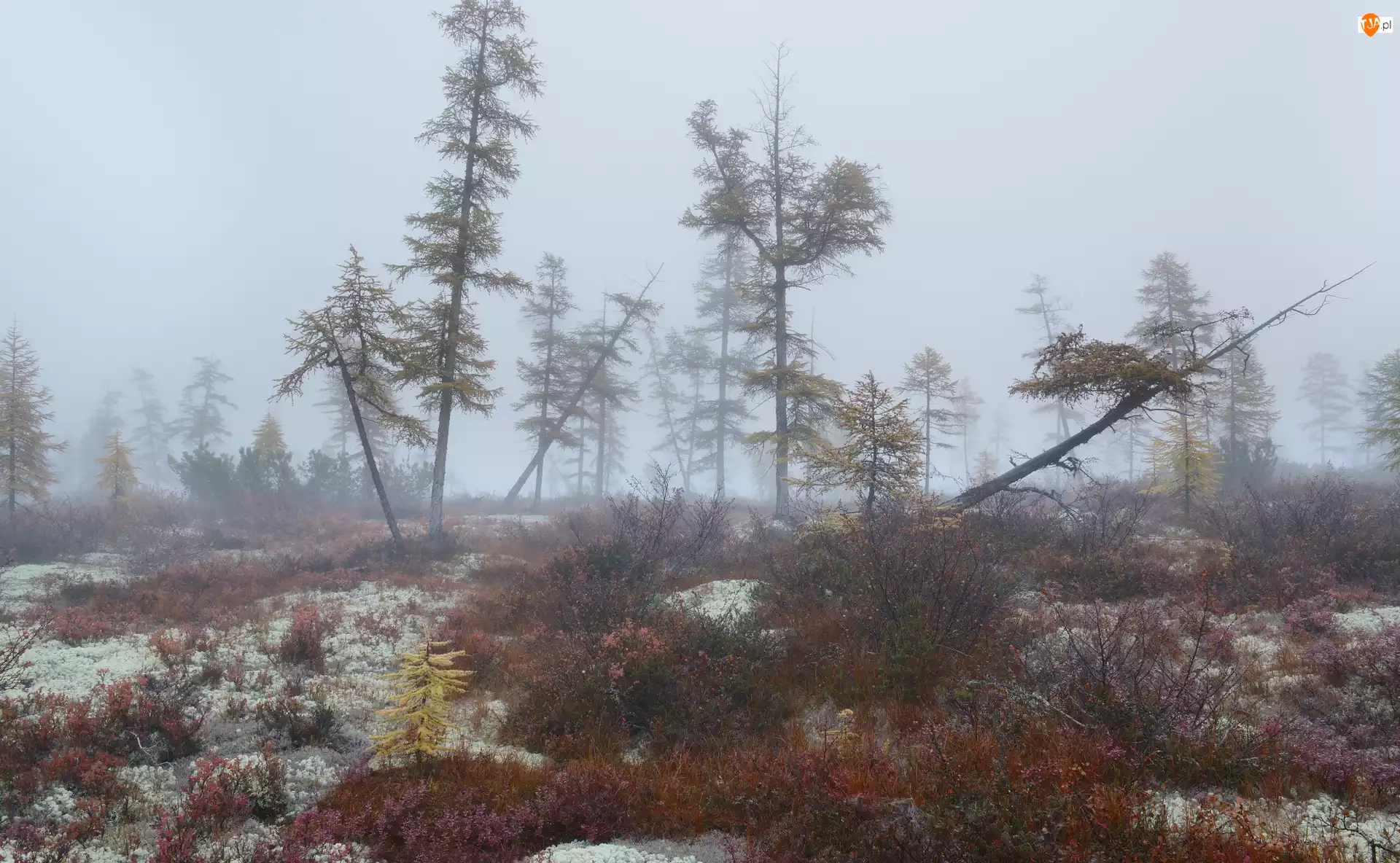 Kołyma, Jesień, Rośliny, Obwód magadański, Mgła, Krzewy, Rosja, Drzewa
