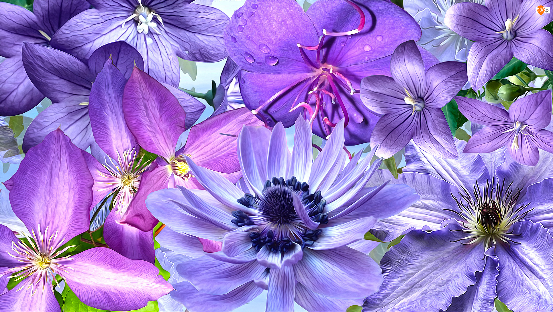 Kwiaty, Fioletowe, Dzwonki, Grafika, Powojniki, Zawilec