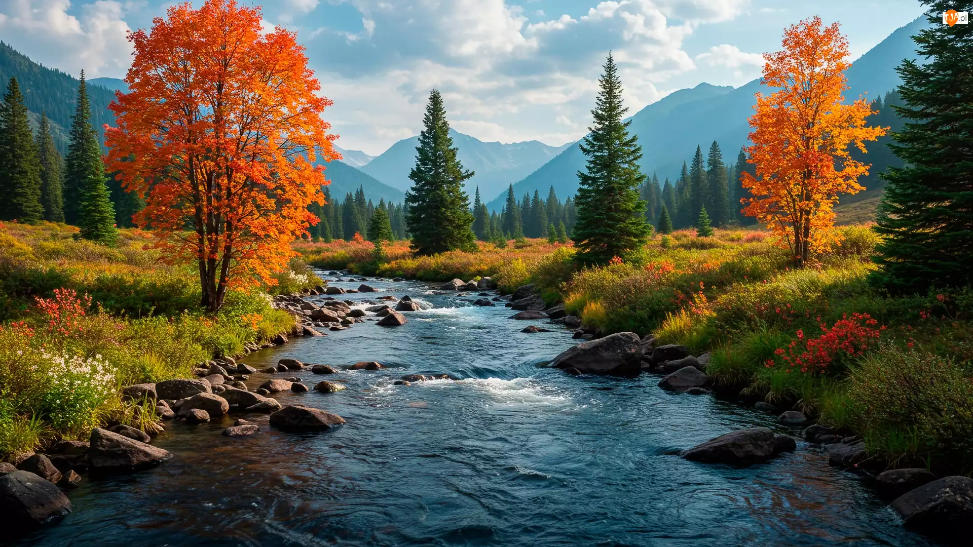 Pożółkłe drzewa i iglaki nad kamienistą rzecz