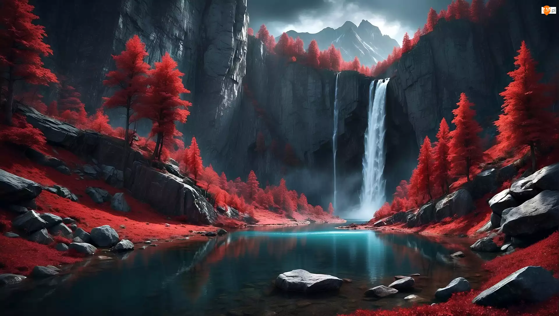Czerwone, Drzewa, Grafika, Jesień, Góry, Rzeka, Wodospad