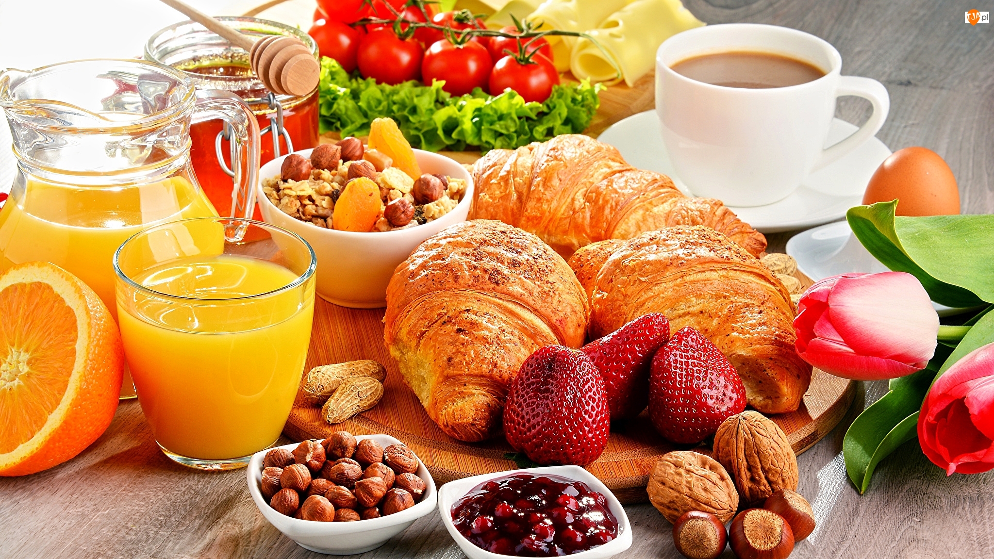 Miód, Rogaliki, Pomarańczowy, Tulipany, Filiżanka, Śniadanie, Truskawki, Sok, Croissanty, Orzechy, Szklanka, Kawa