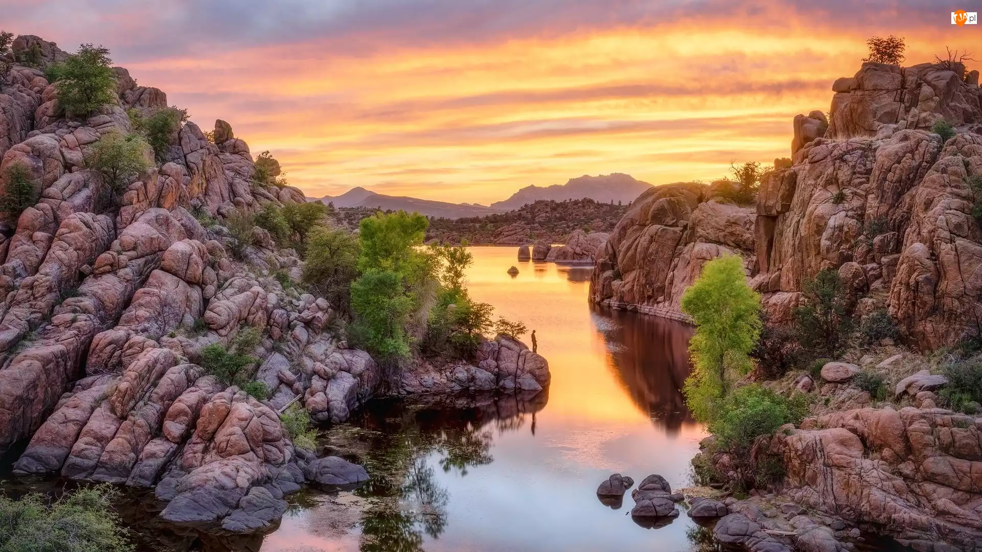 Prescott, Skały, Watson Lake, Arizona, Drzewa, Wschód słońca, Stany Zjednoczone, Jezioro