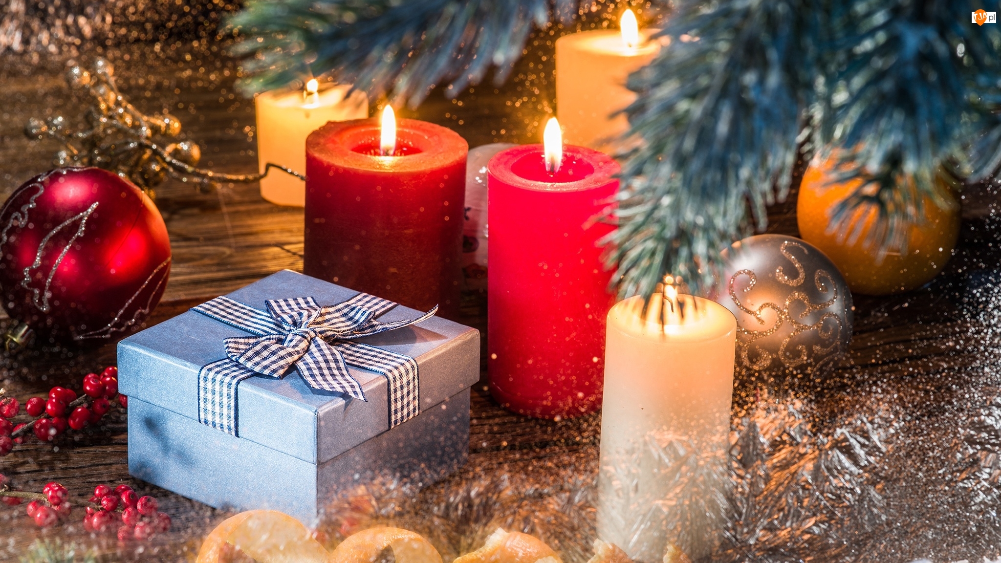 Kompozycja, Świąteczna, Świeczki, Bombki, Boże Narodzenie, Prezent