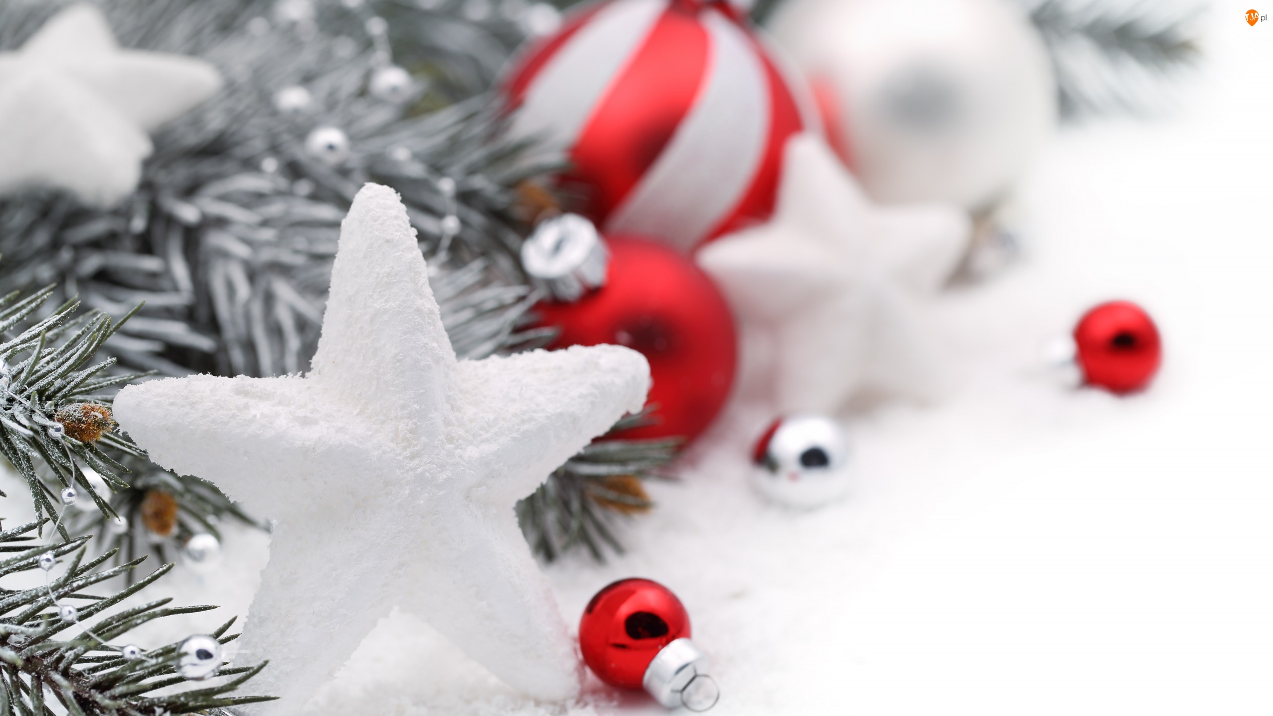 Śnieg, Gwiazdki, Kompozycja, Świąteczna, Gałązki, Boże Narodzenie, Bombki