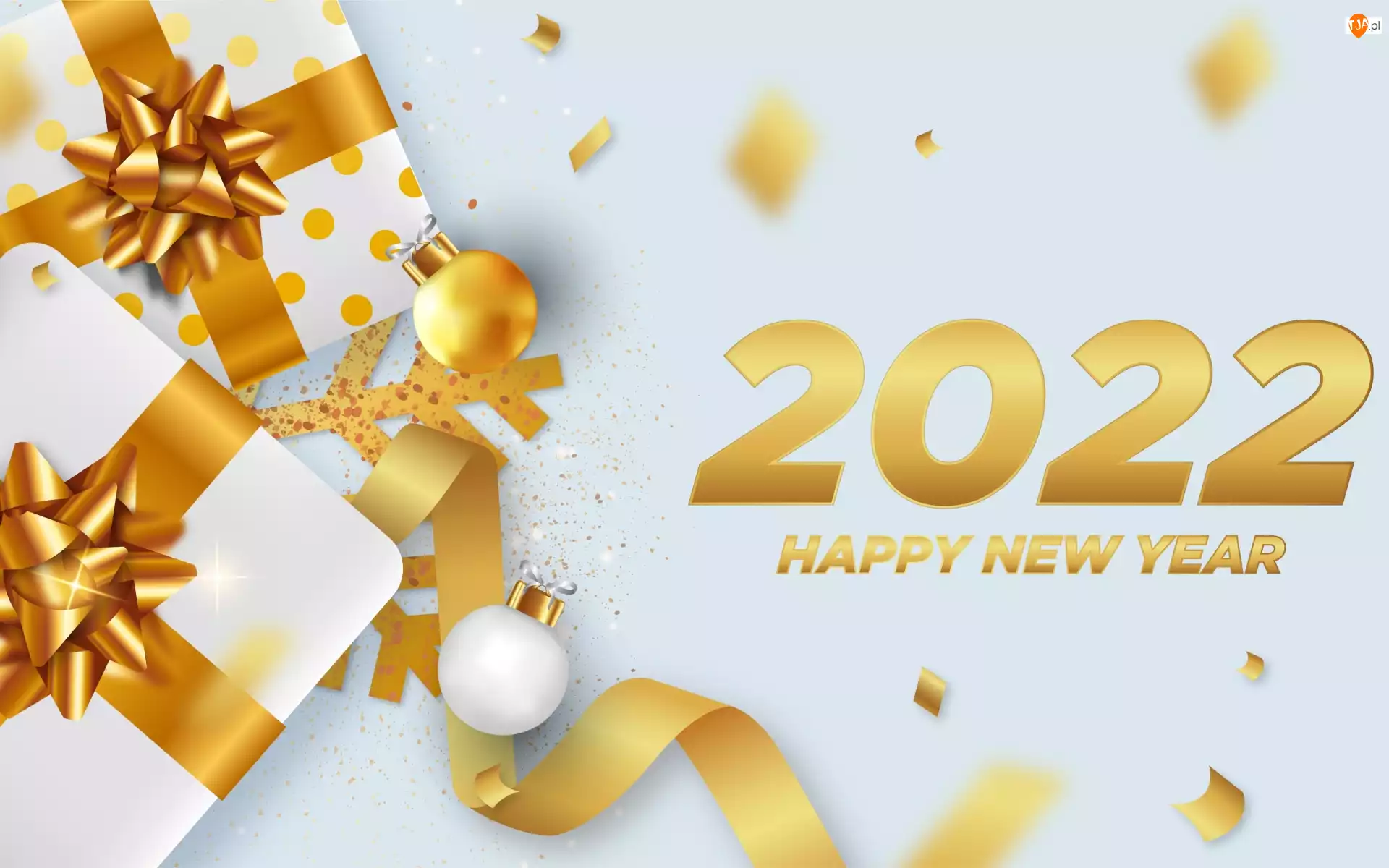 Konfetti, Data, Bombki, Nowy, Napis, Wstążka, Rok, Prezenty
