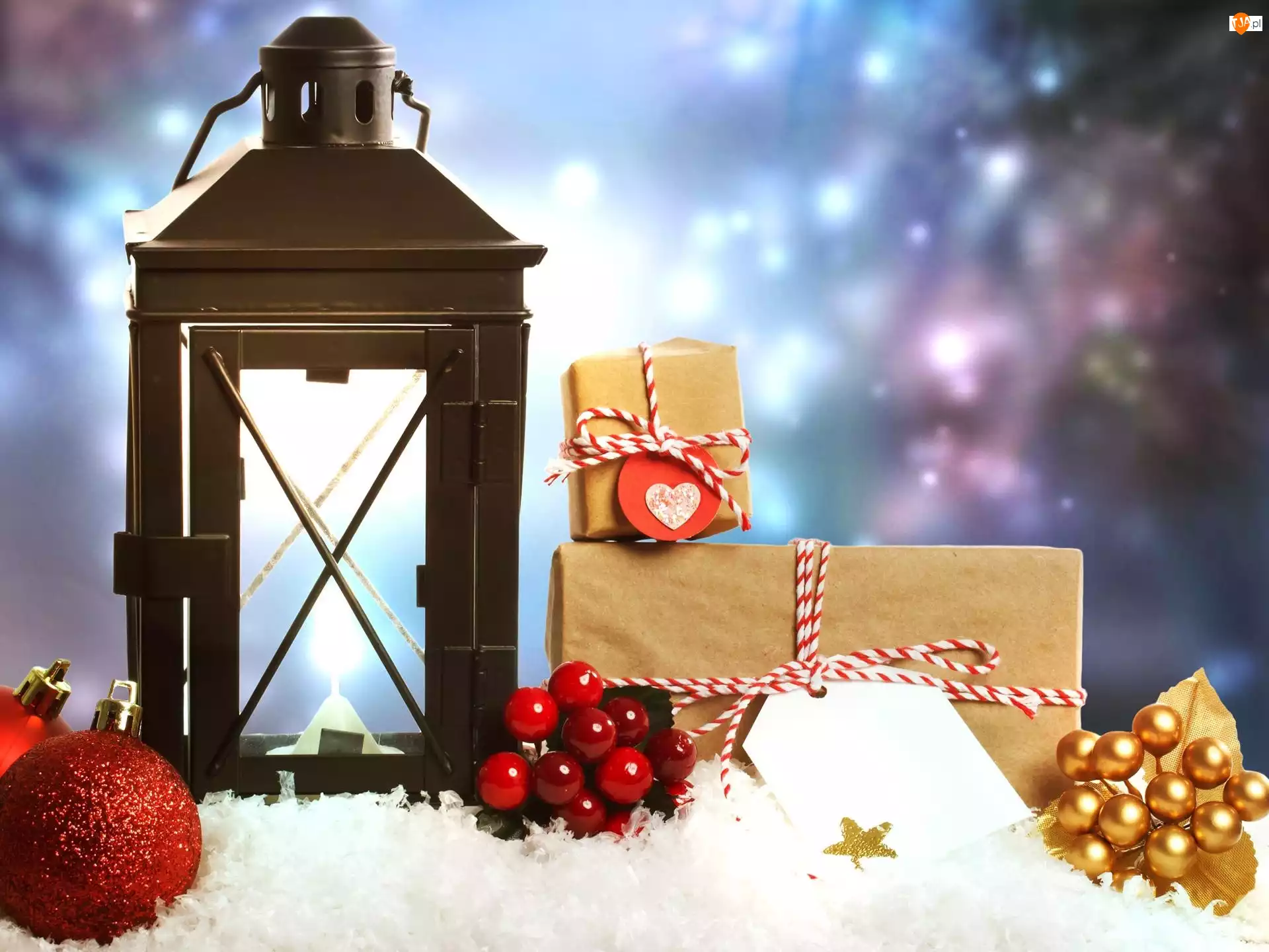 Prezenty, Kompozycja, Bombki, Lampion, Śnieg, Bo�