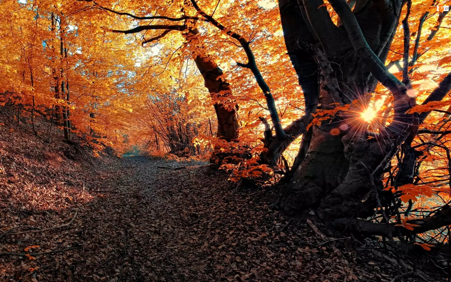 Promienie, Przebijające, Las, Jesień, Słońca, Droga, Światło