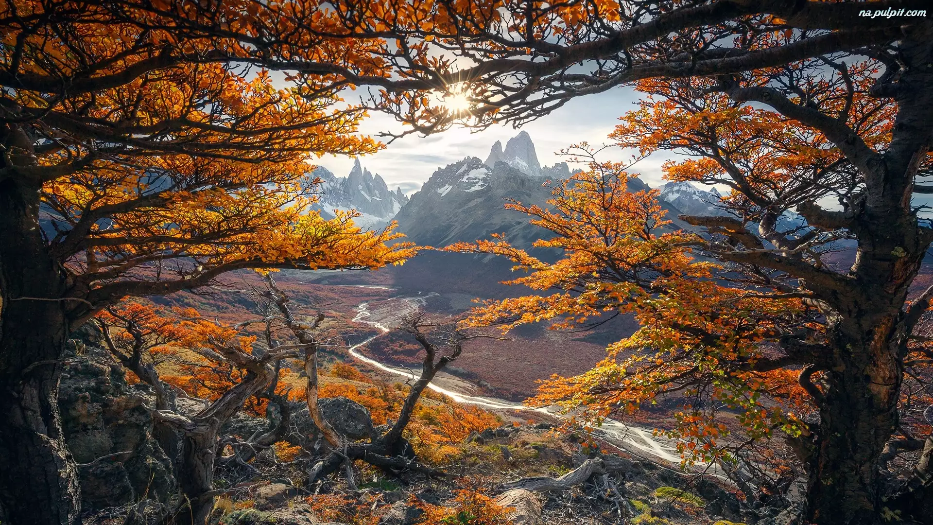 Promienie słońca, Gałęzie, Drzewa, Szczyt Fitz Roy, Patagonia, Argentyna, Jesień, Park Narodowy Los Glaciares, Góry, Rzeka Rio de las Vueltas