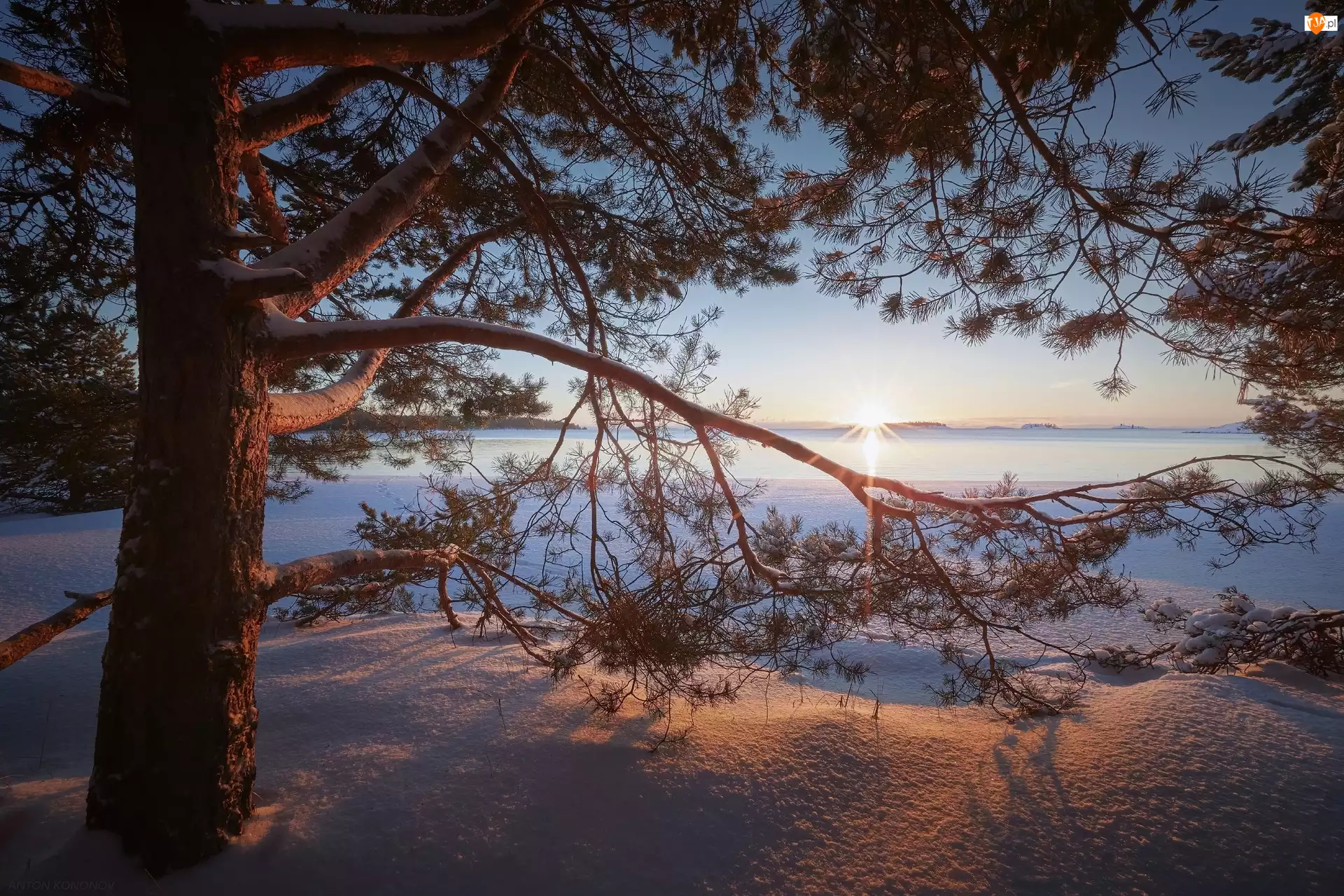 Drzewo, Sosna, Rosja, Zima, Karelia, Promienie słońca, Jezioro Ładoga