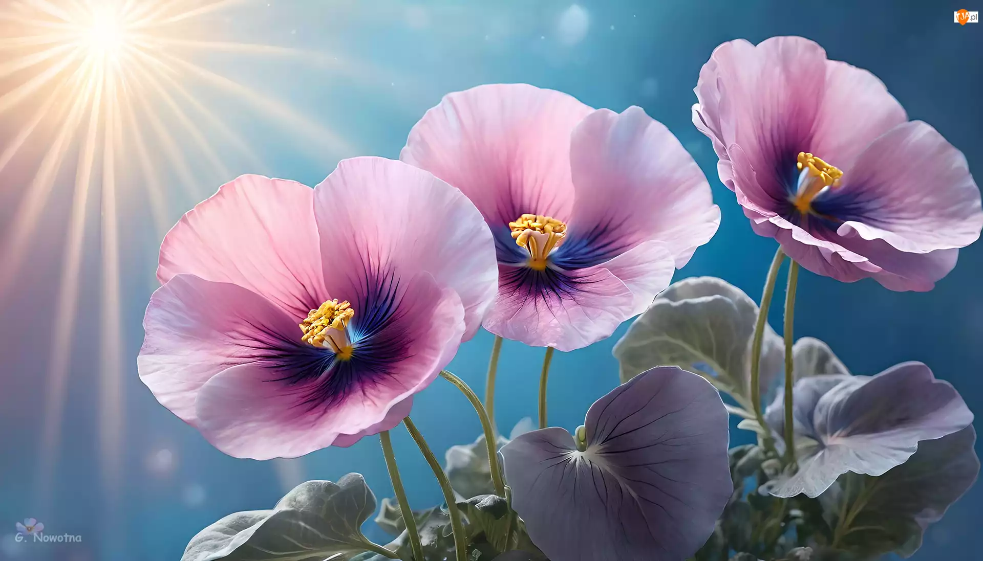 Żółte, Bratki, Kwiaty, Grafika, Niebieskie, Słońce