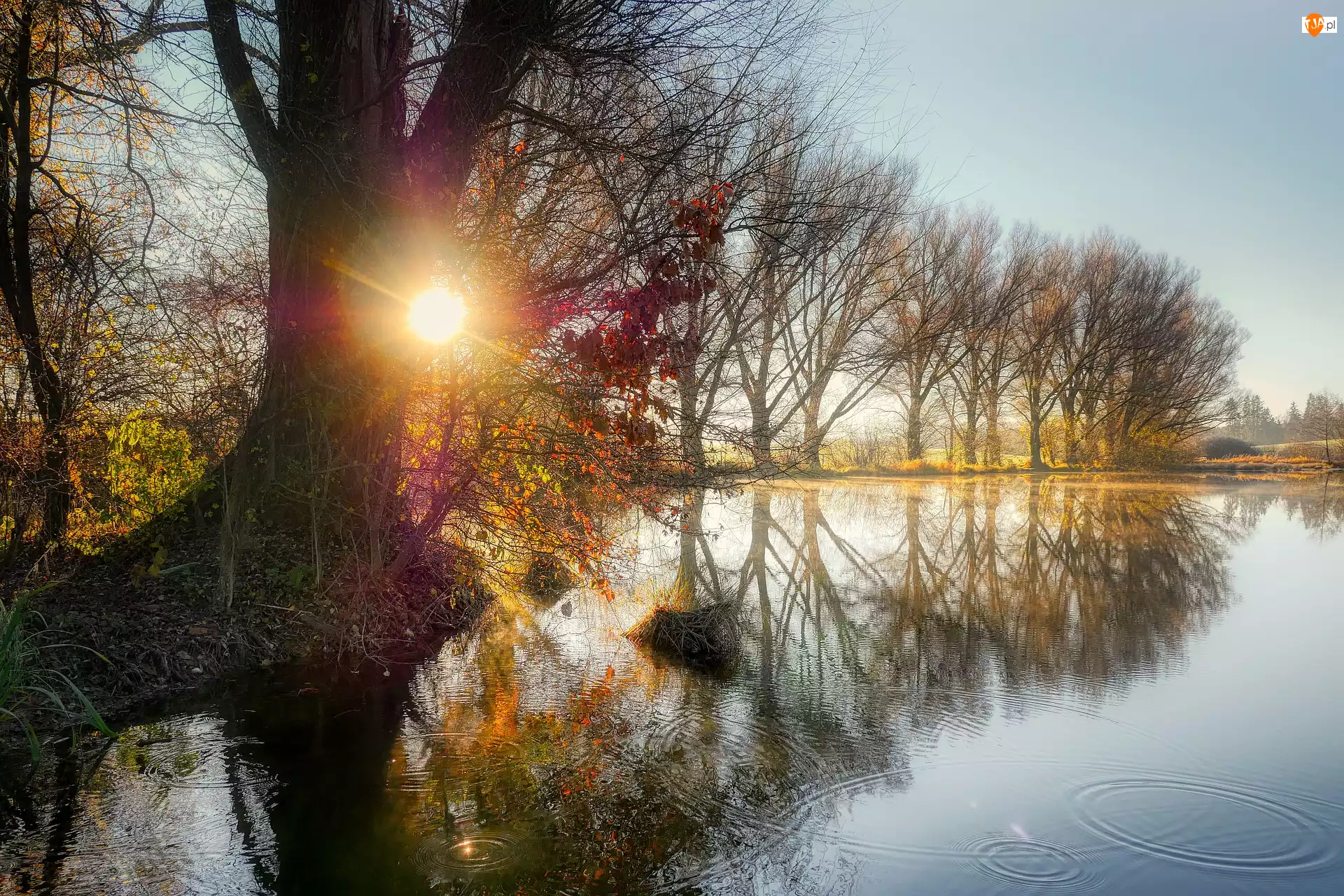 Promienie słońca, Staw, Drzewa, Jesień