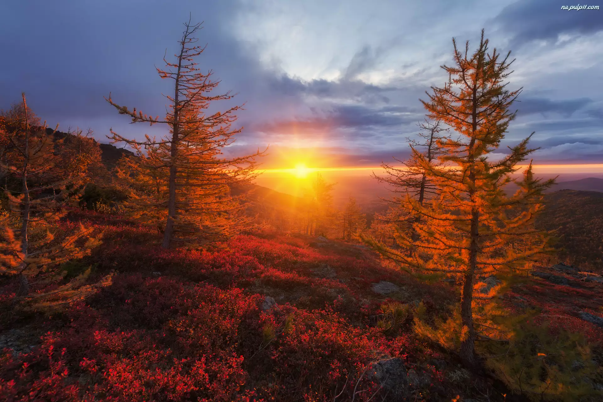 Promienie słońca, Wzgórza, Drzewa, Jesień, Rośliny