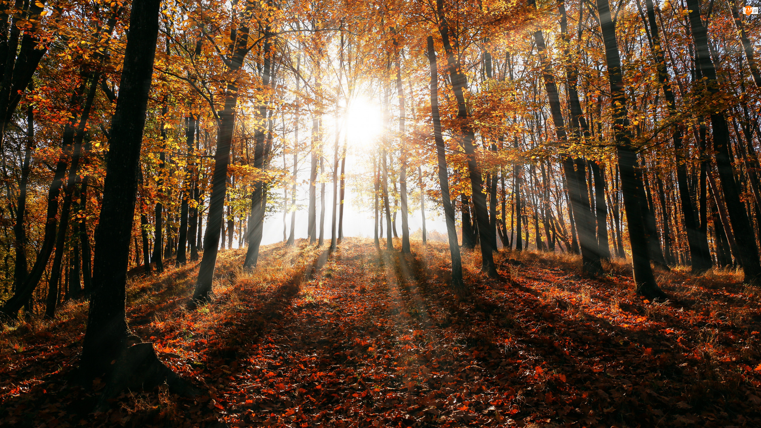 Las, Jesień, Opadłe, Promienie słońca, Drzewa, Liście