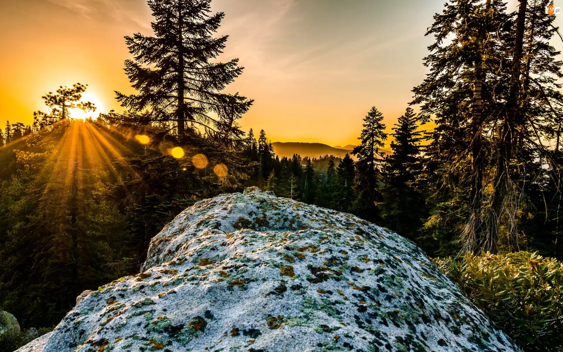 Promienie, Zachód, Góry, Słońca, Drzewa