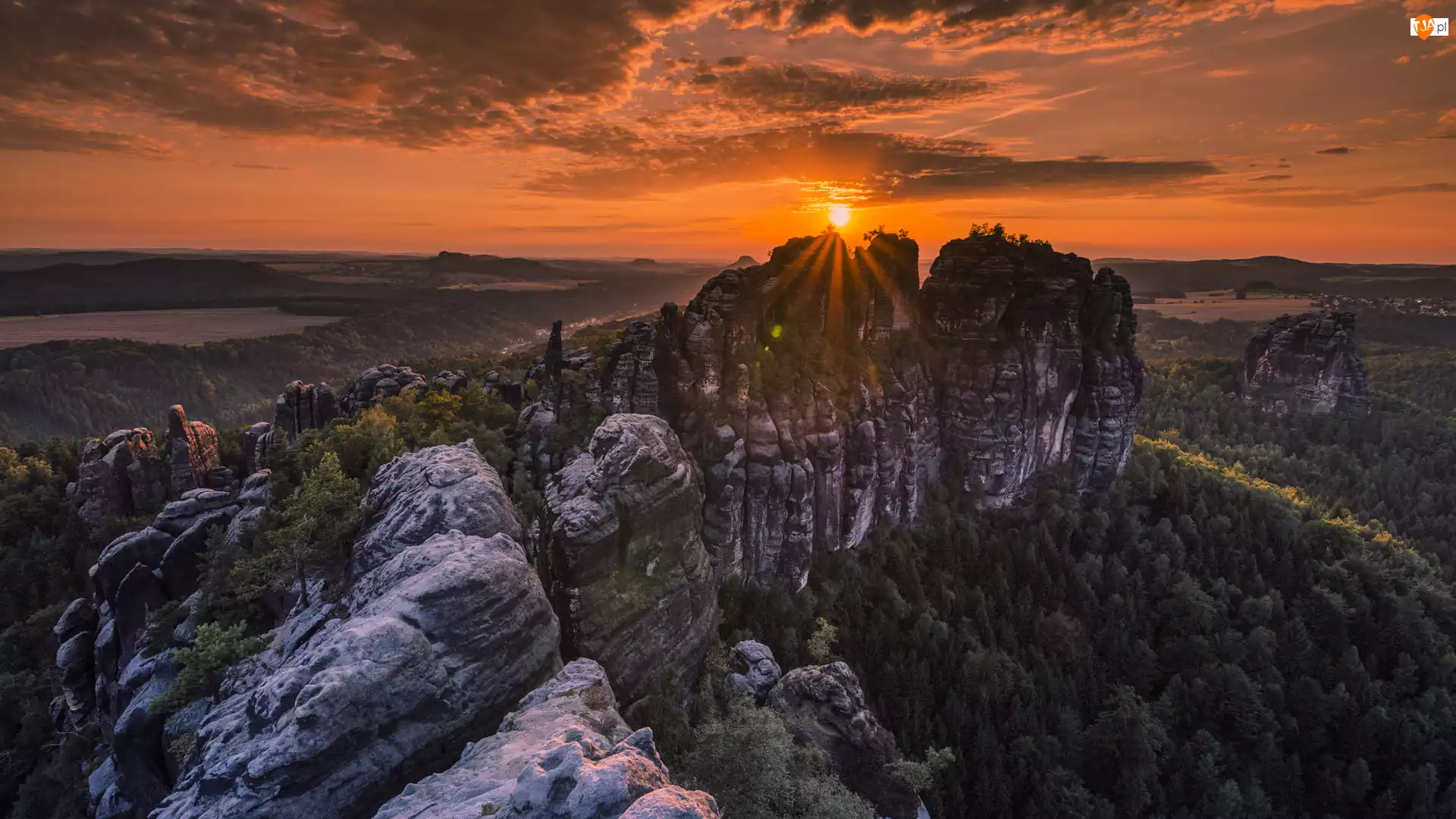 Promienie słońca, Niemcy, Góry Połabskie, Saska Szwajcaria, Drzewa